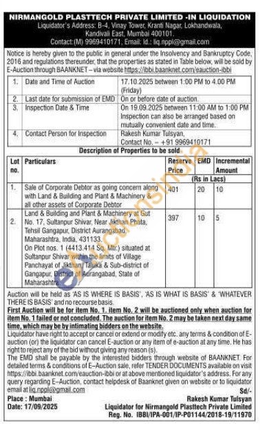 1) Sale of Corporate Debtor as going concem along with Land & Building and Plant & Machinery & all other assets of Corporate Debtor