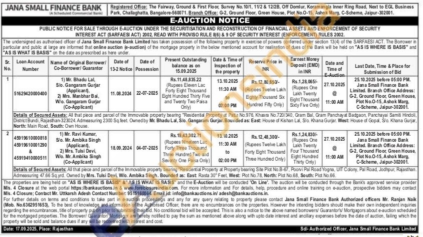Details of Secured Assets: All that piece and parcel of the Immovable property bearing "Residential Property at Patta No.976, Khasra No.720/340, Gram Bal, Gram Panchayat Badgaon, Panchayai Samil Hindoli, District Bundi, Rajasthan-323024. Admeasuring 2300 Sq.feet. Owned by Mr. Bhadu Lal, S/o. Gangaram Gurjar. Bounded as: East: House of Kishan Lal, Sio. Khana Gurjar. West: House of Gopal, Sio. Khana Gurjar, North: Main Road, South: Own House.