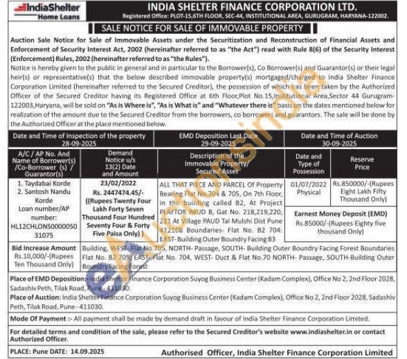 ALL THAT PIECE AND PARCEL Of Property Bearing Flat No.704 & 705, On 7th Floor, in the building called 82, At Project PLAYTOR PAUD B, Gat No. 218,219,220, 221 At Village PAUD Tal Mulshi Dist Pune 412108 Boundaries- Flat No. 82 704 EAST-Building Outer Boundry Facing 83Flat No. 82 705: EAST- Flat No. 704, WEST- Duct & Flat No.70 NORTH-Passage, SOUTH-Building Outer Building, WEST-Flat No.705, NORTH-Passage, SOUTH-Building Outer Boundry Facing Forest Boundaries Boundry Facing Forest