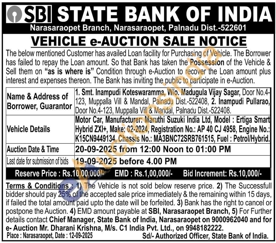 Motor Car, Manufacturer: Maruthi Suzuki India Ltd, Model: Ertiga Smart Hybrid ZXI+, Make: 02-2024, Registration No.: AP 40 CJ 4958, Engine No.: K15CN9449134, Chassis No.: MA3BNC72SRB761515, Fuel : Petrol/Hybrid