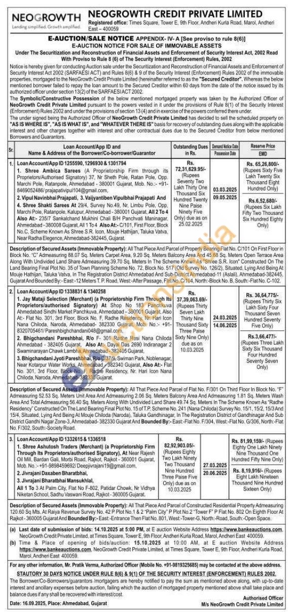 Description of Secured Assets (Immovable Property): All That Piece And Parcel of Property Bearing Flat No. C/101 On First Floor in Block No. "C" Admeasuring 88.07 Sq. Meters Carpet Area, 9.20 Sq. Meters Balcony Area And 45.68 Sq. Meters Open Terrace Area Along With Undivided Land Share Admeasuring 39.70 Sq. Meters In The Scheme Known As "Shree S.R. Icon" Constructed On The Land Bearing Final Plot No. 35 of Town Planning Scheme No. 72. Block No. 517 (Old Survey No. 126/2), Situated, Lying And Being At Mouje Hathijan, Taluka Vatva, In The Registration District Ahmedabad And Sub-District Ahmedabad-11 (Aslali), Ahmedabad-382445, Gujarat And Bounded By:-East:-12 Meters T. P. Road, West: After Passage, Flat No. C/104, North:-Block No. B, South:-Flat No. C-102