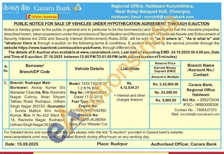 Model: TATA TIGOR XT 1.2 RTN BS4 Reg No: UK06AS8954 Dated 17.10.2018 Fuel Type: PETROL Engine No: EVTRN05HRYK82590 Chassis No: MAT629251JKJ86364 Type- Four Wheeler Car