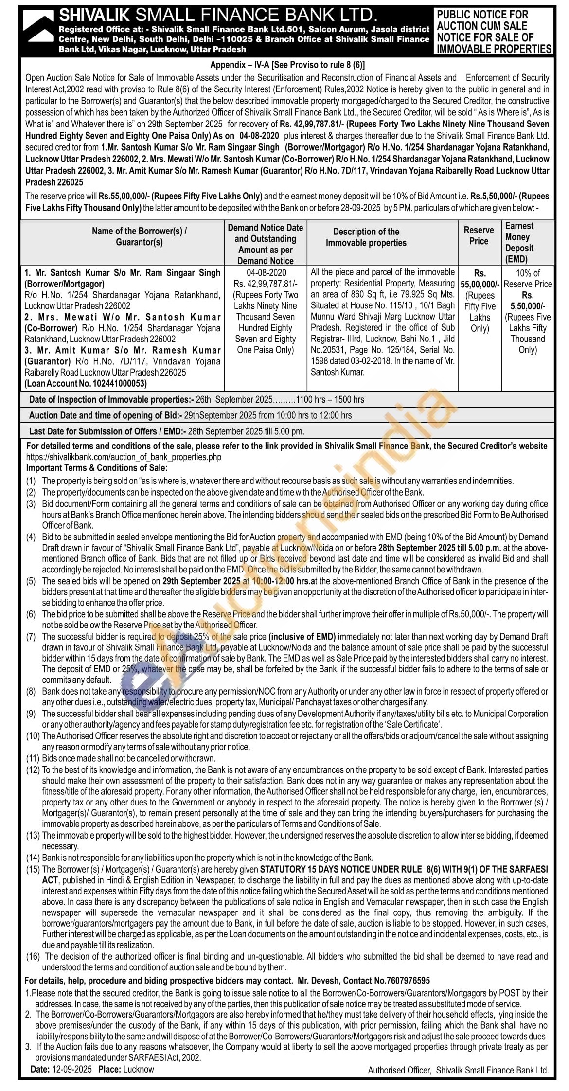 All the piece and parcel of the immovable property: Residential Property, Measuring an area of 860 Sq ft, is 79.925 Sq Mis. Situated at House No. 115/10, 10/1 Bagh Munnu Ward Shivaji Marg Lucknow Uttar Pradesh. Registered in the office of Sub Registrar Ilird. Lucknow, Bahi No.1 Jild No.20531, Page No. 125/184, Serial No. 1598 dated 03-02-2018, in the name of Mr. Santosh Kumar.