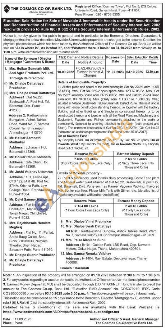 2) Plant & Machinery used for milk dairy processing, Cattle Feed plant and Mineral water plant situated at Gat No.22, Sastewadi, at post Hol Tal. Baramati, Dist. Pune such as Paneer Vacuum Packing, Flavored Milk Bottler sterilizer, Flavor Milk Tank with Stirrer, etc. (detailed list of machinery available with authorized officer)
