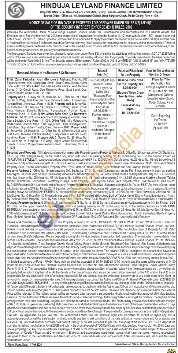 Description of Property: All that part and parcel of immovatie Property bearing Property Address 1: Ofice No. 20 admeasuring 408, Sq. fsi.e 37.91 Sq. mirs. (Carpet area), on the First Fibor, along with open car parking bearing no. 39, in the wing no. B, in the building known as "NIRMAANN ESTRELLA", constructed on land bearing admeasuring 92 Ri.e. 9200 So'mits. Out of survey No. 25 Hissa No. 1/3 (old Survey No. 13 Hasa Noi. 1/31) totaladineasuring 01H 13.93R situated at Kondhwa Budruk Taluka Havell District Pune. Boundaries: North: By Pushpa Steel's Property East: By Shri, Ashok Sav's Property, West: By 40 Meter DP Road South By 24DP Road and Shri. Laxman Maral's Property Property Address 2: Office No. 19 admeasuring 291, Sq.fts.ie. 27.04 Sq. mirs. (Carpetarea), on the First Floor, along with open car parking bearing no. 38, in the wing no. B, in the building known as "NIRMAANN ESTRELLA", constructed on land bearing admeasuring 92R 9200 Sq mls. Out of survey No. 25 Hissa No. 1/3 (old Survey No. 13 Hissa No. 1/31) total admeasuring 01 H13.93R situated at Kondhwa Budruk Taluka Havell District Pune. Boundaries: North: By Pushpa Steel's Property East: By Shri Ashok Sav's Property. West: By 40 Meter DP Road. South By 24 DP Road and Shri. Laxman Maral's Property: Property Address 2 Shop No. 15 admeasuring 612 Sq. ft.ie. 56.87 Sq. mitrs. (Carpetama) Loft admeasuring 249 Sq. Fts in. 23.14 Sq. mers, on the upperground floor, along with open car parking bearing no. 01, in the wing no. 8, in the building known as "NIRMAANN ESTRELLA", constructed on land bearing admeasuring 92 Rie. 9200 Sq mis. Out of survey No. 25 Hissa No. 1/3 (old Survey No. 13 Hissa No. 1/31) total adimeasuing 01 H 13.93 R situated at Kondhwa Budruk' Taluka Haveli District Pune. Boundaries: North By Pushpa Steel's Property East By Shri. Ashok Sav's Property, West By 40 Meter DP Road South: By 24 DP Road and Shri Laxman Maral's Property Property Address 4: Shop No. 14 admeasuring 278 Sq fts. ie.25.83 Sq.mtrs. (Carpet area)+Loft admeasuring 143 Sq. Ftsie. 13.28 Sq. miles, on the upper ground floor, along with open car parking bearing no. 02, in the wing no. B, in the building known as "NIRMAANN ESTRELLA", constructed on land beating admeasuring 92 Rie. 9200 Sq mts. Out of survey No. 25 Hissa No. 1/3 (old Survey No. 13 Hissa No 1/31) total admeasuring 01H 13.93R situated at Kondhwa Budruk Taluka Havell District Pune. Boundaries: North: By Pushpa Steel's Property East: By Shri. Ashok Sav's Property, West By 40 Meter DP Road. South: By 24DP Road and Shri. Laxman Maral's Property