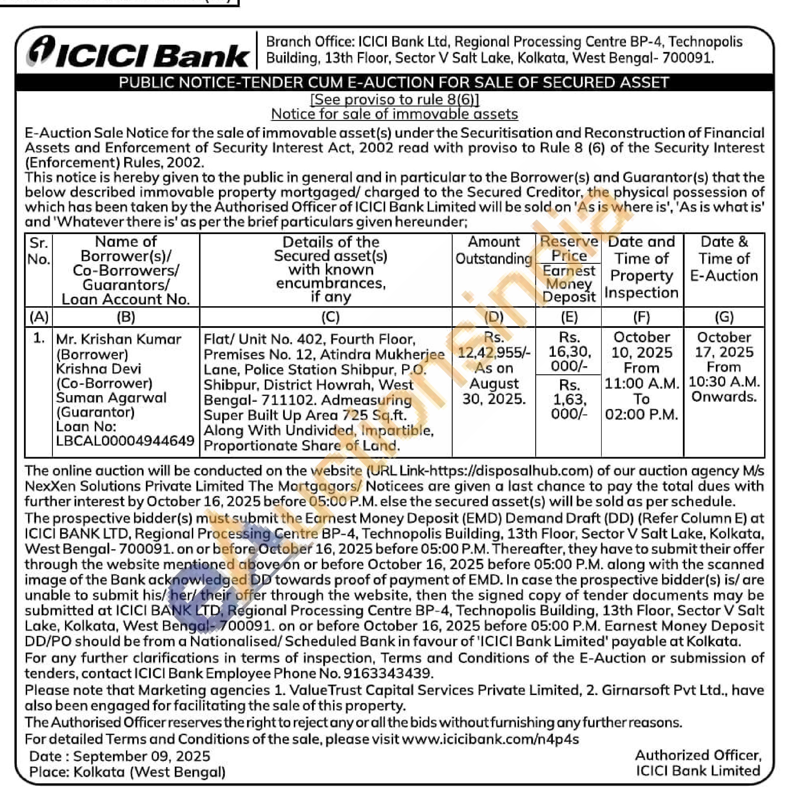 Flat/Unit No. 402, Fourth Floor, Premises No. 12, Atindra Mukherjee Lane, Police Station Shibpur, P.O. Shibpur, District Howrah, West Bengal-711102. Admeasuring Super Built Up Are Up Area 725 Sq.ft. Along With Undivided, Impartible, Proportionate Share of Land