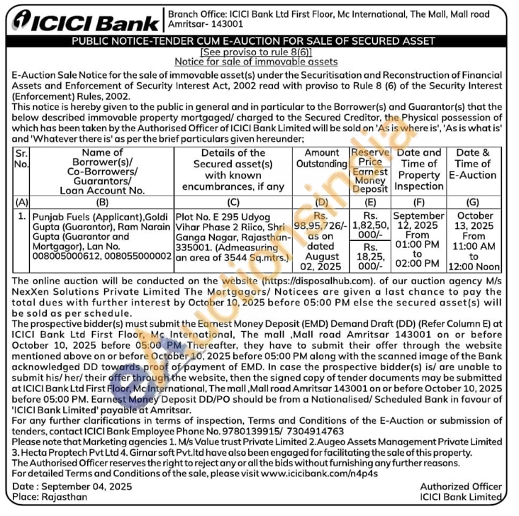 Plot No. E 295 Udyog Vihar Phase 2 Riico, Shri Ganga Nagar, Rajasthan-335001. (Admeasuring an area of 3544 Sq.mtrs.)