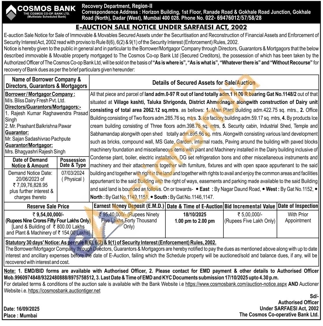 All that piece and parcel of land adm.0-97 R out of land totally adm.1 H 00 R bearing Gat No.1148/2 out of that situated at Village kashti, Taluka Shrigonda, District Ahmednagar alongwith construction of Dairy unit consisting of total area 2062.12 sq.mtrs. as bellows: 1. Main Plant Building adm.422.75 sq. mtrs., 2. Office Building consisting of Two floors adm.285.76 sq. mtrs. 3. Ice factory building adm.59.17 sq. mtrs, 4. By products Ice cream building consisting of Three floors adm.398.78 sq. mtrs, 5. Security cabin, Industrial Shed, Temple and Sabhamandap alongwith open shed totally adm.895.66 sq. mtrs. Alongwith consisting various land development such as bricks, compound wall, MS Gate, Garden, Internal roads, Paving around the building with paved blocks machinery foundation and miscellaneous items with plant and Machinery installed in the Dairy building inclusive of Condense plant, boiler, electric installation, DG set refrigeration bons and other miscellaneous instruments and machinery and their attachments together with furniture, fixtures and with open space appurtenant to the said building and together with right in the land and together with rights to avail and enjoy the common areas and facilities appurtenant to the said Building with the right of ways, easements and parking made available to the said Building and said land is bounded as follows. On or towards- East: By Nagar Daund Road, West: By Gat No. 1152, North: By Gat No. 1149, 1151, South: By Gat No.1146, 1147.