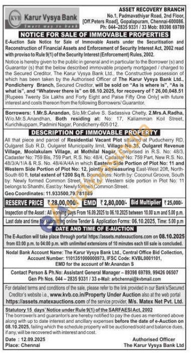 All that piece and parcel of Residential Vacant Plot situated at Puducherry RD, Oulgaret Sub R.D. Oulgaret Municipality limit, Village No 35, Oulgaret Revenue Village, Moolakulam Village, at Mothilal Nagar, Comprised in R.S. No: 48/3, Cadaster No: 750 Bis, 750 Part, R.S. No: 48/4, Cadaster No: 759 Part, New R.S. No. 48/3/A/1/A & R.S. No. 48/4/A/4A in which Eastern Side Portion of Plot No: 11 and Western Side Portion of Plot No: 12, jointly admeasuring East-West 20ft, North-South 60 ft, total extent of 1200 Sq ft. Boundaries: North by: Coconut Groove, South by: Newly forined Common Street, West by: Westem side portion in Plot No: 11 belongs to Shanthi, East by: Newly formed Common Street.