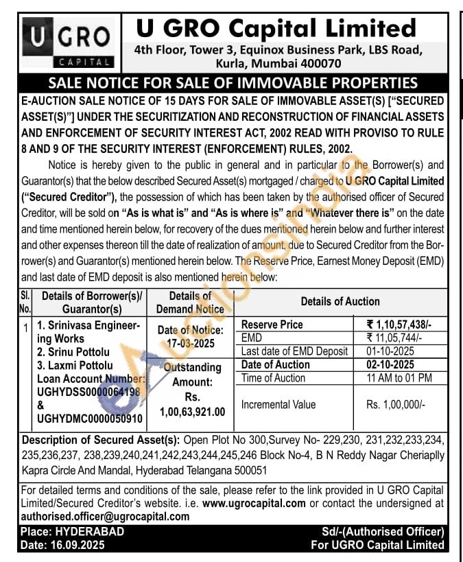Description of Secured Asset(s): Open Plot No 300, Survey No- 229,230, 231,232,233,234, 235,236,237, 238,239,240,241,242,243,244,245,246 Block No-4, B N Reddy Nagar Cheriaplly Kapra Circle And Mandal, Hyderabad Telangana 500051