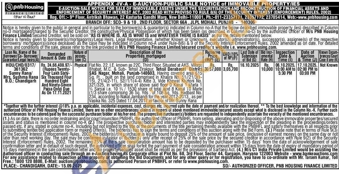 Flat No. 22, I.E. known as 220, Third Floor, Situated at AKS, Village Bhabat, M.C. & Sub- Tehsil Zirakpur, Tehsil Derabassi District SAS Nagar, Mohali, Punjab-140603, Having covered area 615 land comprised in Khasra No. 51//21/3(1-SgF on 21/4(2-11), /1/1(4-4) Kitte 3, Vide Khewat Khatoni No. 321/325, in which share of above said floor 0 Kanal 1 Maria 1 Sarsal i.e. 10/1530 share of total land 8 Kanal 10 Marle 1/3 share comprising 36 Sq. Yds of 108 Sq. Yds. Hadbast No. 234, according to Nakal Jambandi for the year 2012-2013, as per Vasika No. 325 Dated 17.04.2017 in favour of Mr. Sunny Rana