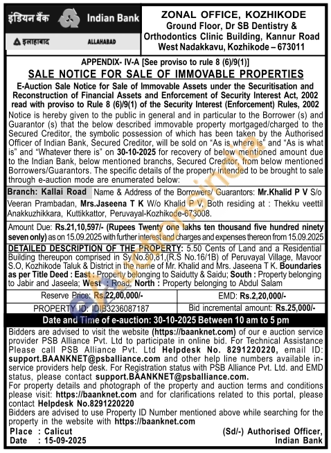 DETAILED DESCRIPTION OF THE PROPERTY: 5.50 Cents of Land and a Residential Building thereupon comprised in Sy.No.80,81, (R.S No. 16/1B) of Peruvayal Village, Mavoor S.O, Kozhikode Taluk & District in the name of Mr. Khalid and Mrs. Jaseena T K. Boundaries as per Title Deed: East: Property belonging to Saidutty & Saidu; South: Property belonging to Jabir and Jaseela; West Road; North: Property belonging to Abdul Salam