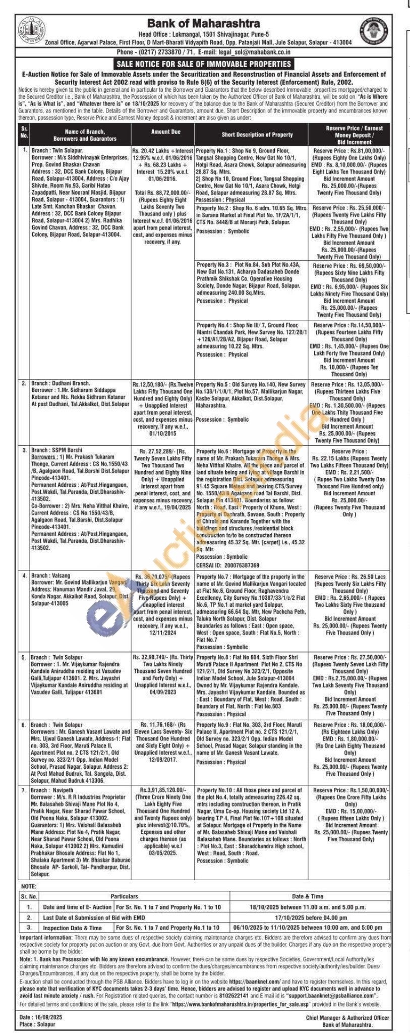 Property No.9: Flat No. 303, 3rd Floor, Maruti Palace II, Apartment Plot no. 2 CTS 121/2/1, Old Survey no. 323/2/1 Opp. Indian Model School, Prasad Nagar, Solapur standing in the name of Mr. Ganesh Vasant Lawate. Possession: Physical