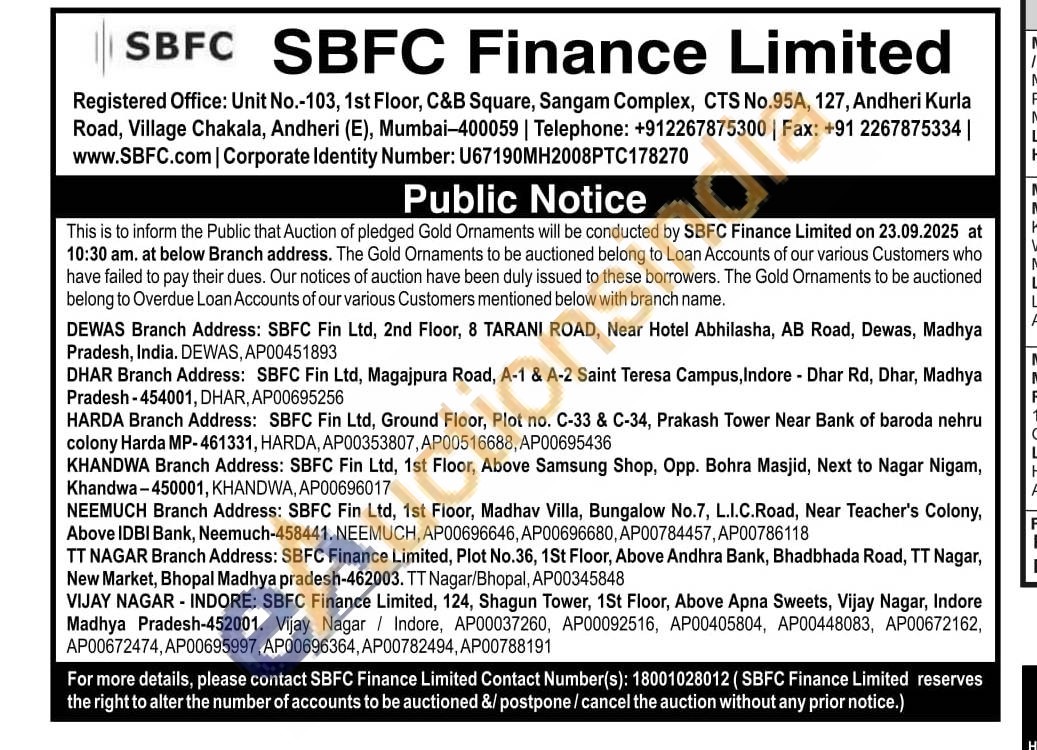 SBFC Finance Ltd Gold Auctions Auction in Dewas