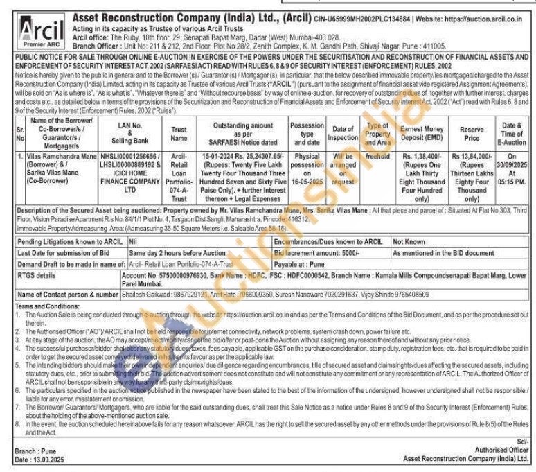 Mrs. Sarika Vilas Mane: All that plece and parcel of: Situated At Flat No 303, Third Floor, Vision Paradise Apartment Rs No. 84/1/1 Plot No. 4, Tasgaon Dist Sangli, Maharashtra. Pincode: 416312 immovable Property Admeasuring Area: (Admeasuring 36-50 Square Meters le. Saleable Area 58-16)