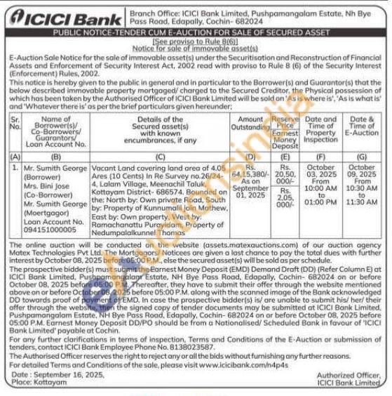 Vacant Land covering land area of 4.05 Ares (10 Cents) in Re Survey no.26/24-4. Lalam Village, Meenachil Taluk, Kottayam District-686574. Bounded on the: North by: Own private Road, South by: Property of Kunnumalil jain Mathew, East by: Own property. West by: . Ramachanattu Purayidam, Property of Nedumpalalkunnel Thomas