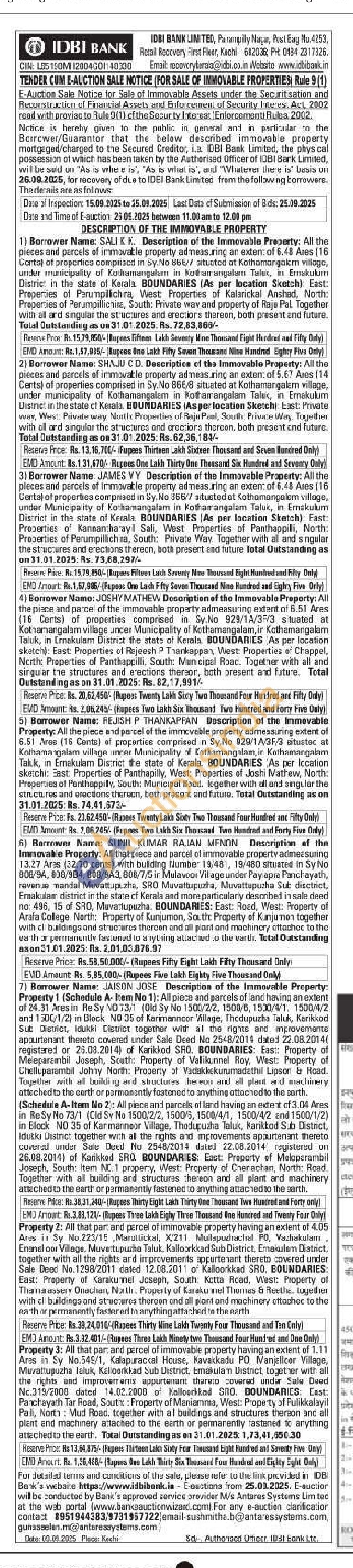Description of the Immovable Property: All that piece and parcel of immovable property admeasuring 13.27 Ares (32.70 cents) with building Number 19/481, 19/480 situated in Sy. No 808/94, 808/984, 808/9A3, 808/7/5 in Mulavoor Village under Payiapra Panchayath, revenue mandal Muvattupuzha, SRO Muvattupuzha, Muvattupuzha Sub disctrict, Ernakulam district in the state of Kerala and more particularly described in sale deed no: 496, 15 of SRO, Muvattupuzha. BOUNDARIES: East: Road, West: Property of Arafa College, North: Property of Kunjumon, South: Property of Kunjumon together. with all buildings and structures thereon and all plant and machinery attached to the earth or permanently fastened to anything attached to the earth. Total Outstanding as on 31.01.2025: Rs. 2,01,03,876.97