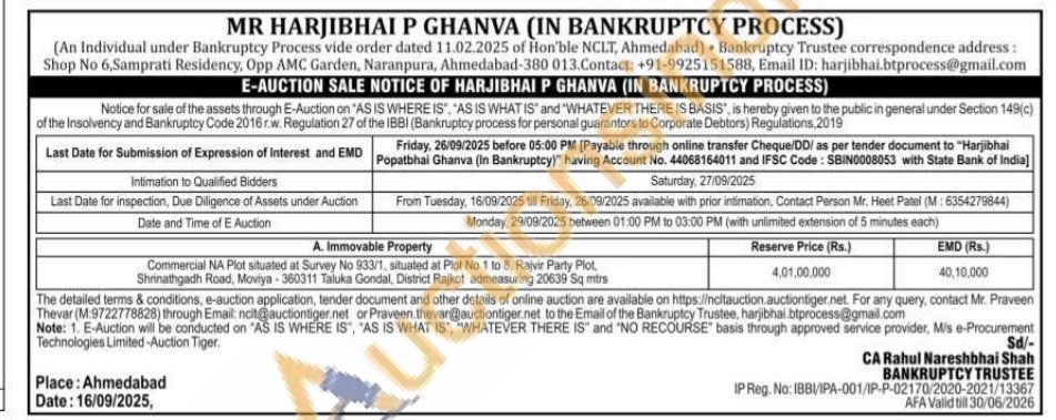 Commercial NA Plot situated at Survey No 933/1, situated at Plot No 1 to 8, Rajvir Party Plot. Shrinathgadh Road, Moviya 360311 Taluka Gondal, District Rajkot admeasuring 20639 Sq mtrs