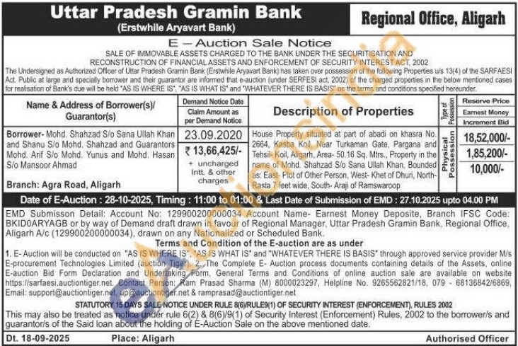 House Property situated at part of abadi on khasra No. 2664, Kasba Koil, Near Turkaman Gate, Pargana and Tehsil-Koil, Aligarh, Area- 50.16 Sq. Mtrs., Property in the name of Mohd. Shahzad Sio Sana Ullah Khan, Bounded as: East-Plot of Other Person, West- Khet of Dhuri, North-Rasta 7 feet wide, South- Araji of Ramswaroop