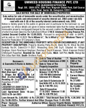 PROPERTY DESCRIPTION: Property Bearing Patta No.48, Book No. 18. Misal No.200. Sankalp No.04, Dated-23-11-2021, Measuring Area 348 Sq.ft. Situated At- Village Singhpur, Gram Panchayat Singhpur, Panchayat Samiti Kapasan, Tehsil Kapasan District Chittorgarh Rajasthan. Bounded As- East-Aam Rasta, West-Self Plot, North-Mangi Bal Wio Udau Ram Mali, South- Brothers Rasta