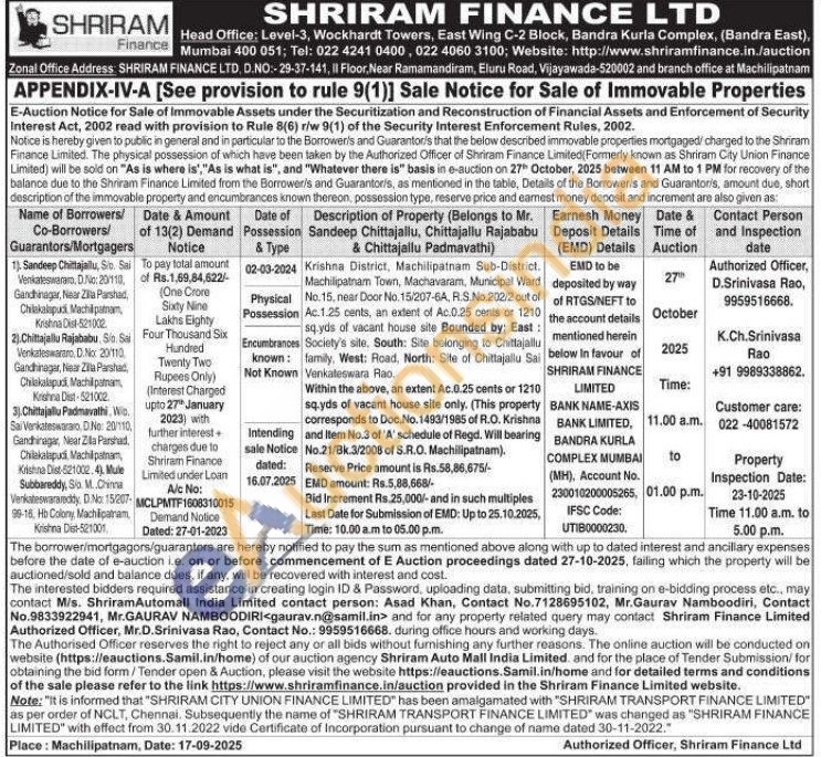 Krishna District, Machilipatnam Sub-District. Machilipatnam Town, Machavaram, Municipal Ward No. 15. near Door No. 15/207-6A, R.S.No.202/2 out of Ac.1.25 cents, an extent of Ac.0.25 cents or 1210 sq.yds of vacant house site Bounded by: East: Society's site, South: Site belonging to Chittajallu family, West: Road, North: Site of Chittajallu Sai Venkateswara Rao.