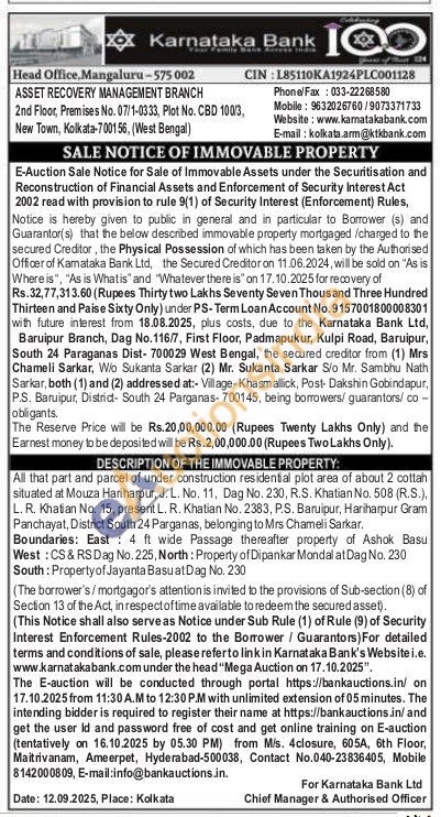 All that part and parcel of under construction residential plot area of about 2 cottah situated at Mouza Hariharpur, J. L. No. 11, Dag No. 230, R.S. Khatian No. 508 (R.S.), L. R. Khatian No. 15, present L. R. Khatian No. 2383, P.S. Baruipur, Hariharpur Gram Panchayat, District South 24 Parganas, belonging to Mrs Chameli Sarkar.