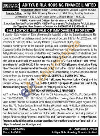 All That Piece And Parcel Of Open Plot No. 29, Admeasuring 1000 Sq. Ft., On Land Kh No. 127-128-132/1, 127-128-132/3/7, Ekta Sai Dham Colony, Gram Palasi, P.H. No. 05, Vikas Khand Phanda, Situated At Tehsil Huzur, District Bhopal Within Nagar Nigam Limits, Ward No. 75, Truba College, Bhopal, Madhya Pradesh, India-462022, And Bounded As: East: Plot No. 30 West: Colony Road North: Colony Road South: Plot No. 28