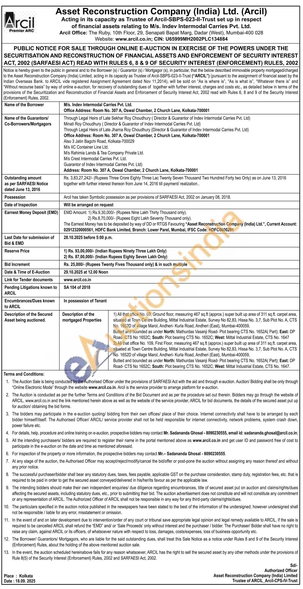 All that office No. 0 Ground floor, measuring 467 sqft (approx) super buit up area of 311 og ft carpet arma situated at Town Centre Building, Mittal Industrial Estate, Survey No 82,83, Hiasa No. 37, Sub Plot No A, CTS No. 16520 of village Marol, Andher-Kurla Road, Anther (East), Mumbai-400059 Butted and bounded as unter North: Mathurcas Vasang Road-Pict bearing CTS No. 1852A( Part) East: DP Road-CTS No 16620 South: Plot bearing CTS No. 18520: West: Mittal Industrial Estate, CTS No. 1647