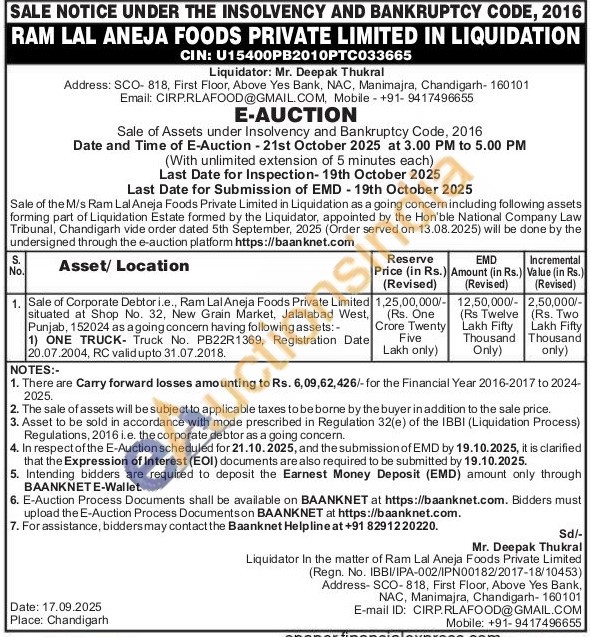 Sale of Corporate Debtori.e., Ram Lal Aneja Foods Private Limited situated at Shop No. 32, New Grain Market, Jalalabad West, Punjab, 152024 as a going concern having followingassets:-