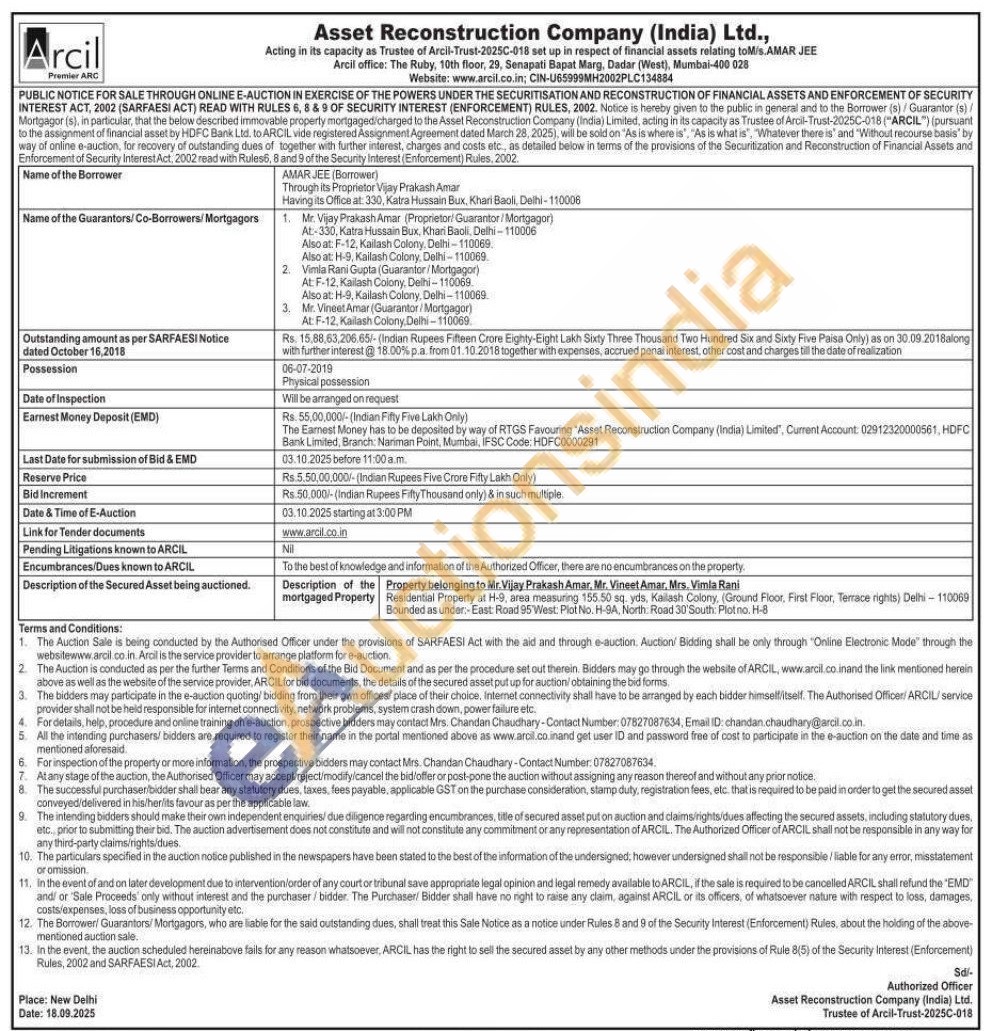 Residential Property at H-9, area measuring 155.50 sq. yds, Kailash Colony, (Ground Floor, First Floor, Terrace rights) Delhi-110069 Bounded as under: East Road 95 West: Plot No. H-SA, North Road 30'South: Plotno. H-8