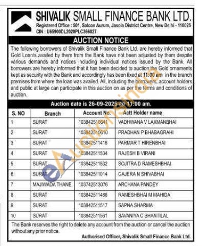 Shivalik Small Finance Bank Ltd Gold Auctions Auction in Pune