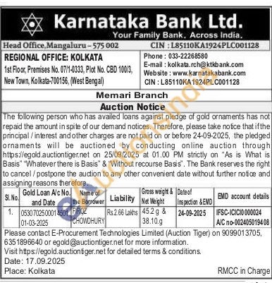 Karnataka Bank Gold Auctions Auction in Kolkata