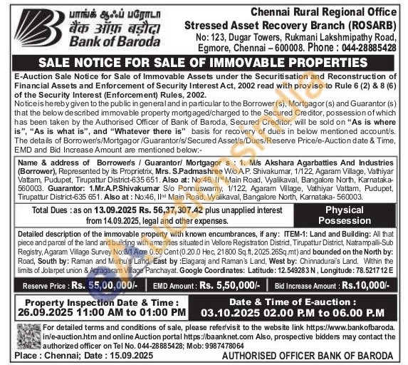 Land and Building: All that piece and parcel of the land and building with amenities situated in Vellore Registration District, Tirupattur District, Natrampalli-Sub Registry, Agaram Village Survey No: 3/1 Acre 0.50 Cent (0.20.0 Hec, 21800 Sq.ft, 2025.26Sq.mt) and bounded on the North by: Road, South by: Raman and Muthu's Land, East by: Elagaraj and Raman's Land, West by: Chinnadurai's Land. Within the limits of Jolarpet union & Agragaram Village Panchayat. Google Coordinates: Latitude: 12.549283 N, Longitude: 78.521712 E