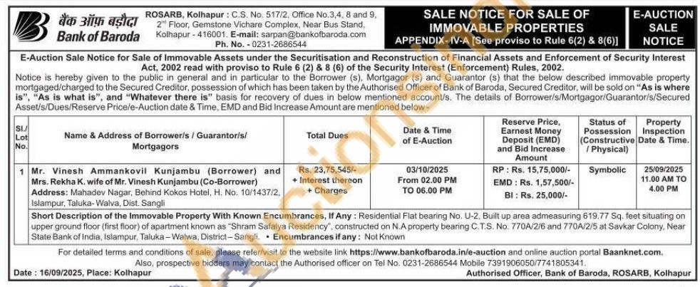 Residential Flat bearing No. U-2, Built up area admeasuring 619.77 Sq. feet situating on upper ground floor (first floor) of apartment known as "Shram Safalya Residency", constructed on N.A property bearing C.T.S. No. 770A/2/6 and 770A/2/5 at Savkar Colony, Near State Bank of India, Islampur, Taluka-Walwa, District-Sangli. Encumbrances if any: Not Known