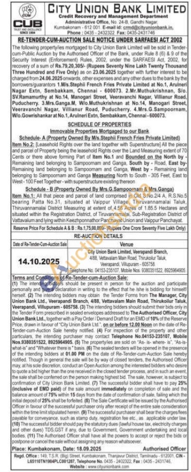 Item No.2: [Leasehold Rights over the land together with Superstructure) All the piece and parcel of Property being the leasehold Rights over the Land Measuring extent of 70 Cents or there above forming Part of Item No.1 and Bounded on the North by Remaining land belonging to Sampoornam and Ganga, South by Road, East by-Remaining land belonging to Sampoomam and Ganga, West by Remaining land belonging to Sampoomam and Ganga Measuring North to South-305 Feet, East to West-100 Feet Together with superstructure existing thereon Schedule-B (Property Owned By Mrs. G. Sampoornam & Mrs.Ganga) Item No.1: All that piece and parcel of land comprised in Old S.No.214 A. R.S.No.5 bearing Patta No.31, situated at Vaippur Village, Thiruvannamalai Taluk, Thiruvannamalai District Measuring at extent of 4.58 Acres of 1.85.5. Hectares and situated within the Registration District, of Tiruvannamalai, Sub-Registration District of Vattavalum and lying within Keezhponnathor Panchayat Union and Vaippur Panchayat