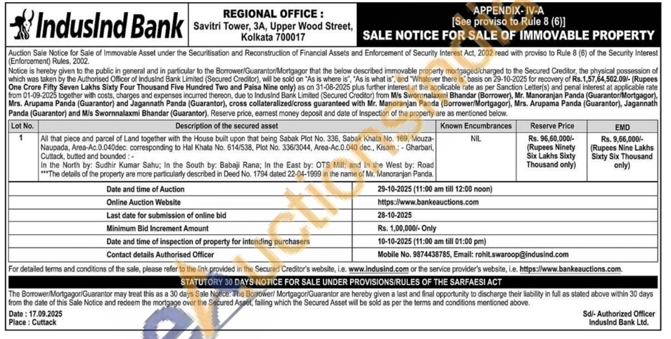 All that piece and parcel of Land together with the House built upon that being Sabak Plot No. 336, Sabak Khata No. 169, Mouza-Naupada, Area-Ac.0.040dec. corresponding to Hal Khata No. 614/538, Plot No. 336/3044, Area-Ac.0.040 dec., Kisam: Gharbari Cuttack, butted and bounded: -In the North by: Sudhir Kumar Sahu; In the South by: Babaji Rana; In the East by: OTS Mill; and In the West by: Road ***The details of the property are more particularly described in Deed No. 1794 dated 22-04-1999 in the name of Mr. Manoranjan Panda