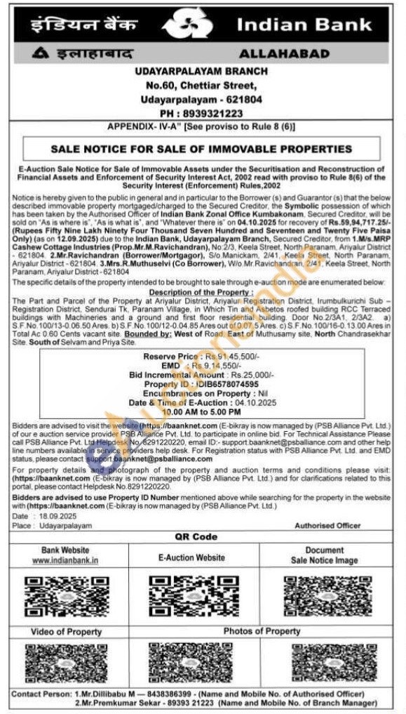 The Part and Parcel of the Property at Ariyalur District, Ariyalur Registration District, Irumbulkurichi Sub-Registration District, Sendurai Tk. Paranam Village, in Which Tin and Asbetos roofed building RCC Terraced buildings with Machineries and a ground and first floor residential building. Door No.2/3A1, 2/342 SF.No. 100/13-0.06.50 Ares. b) S.F.No. 100/12-0.04.85 Ares out of 0.07 5 Ares. c) SF.No. 100/16-0.13.00 Ares in Total Ac 0.60 Cents vacant site. Bounded by: West of Road, East of Muthusamy site, North Chandrasekhar Site South of Selvam and Priya Site