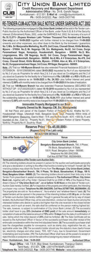 Immovable Property Mortgaged to our Bank (Property Owned by Mr. Nagaraju CM, S/o. Madegowda) : All that Piece and parcel of the Eastern Portion of Property No.62, Khatha No.12/1, Hosakerahalli Village, Uttarahalli Hobli, Bangalore South Taluk, Presently Within limits of BBMP Bangalore. Measuring, East to West-15 ft. and North to South-40 ft. = 600 Sq. ft. and bounded on the East by: Property No.61, West by: Westem Portion of Same Property, North by: Property No.41, South by: Road
