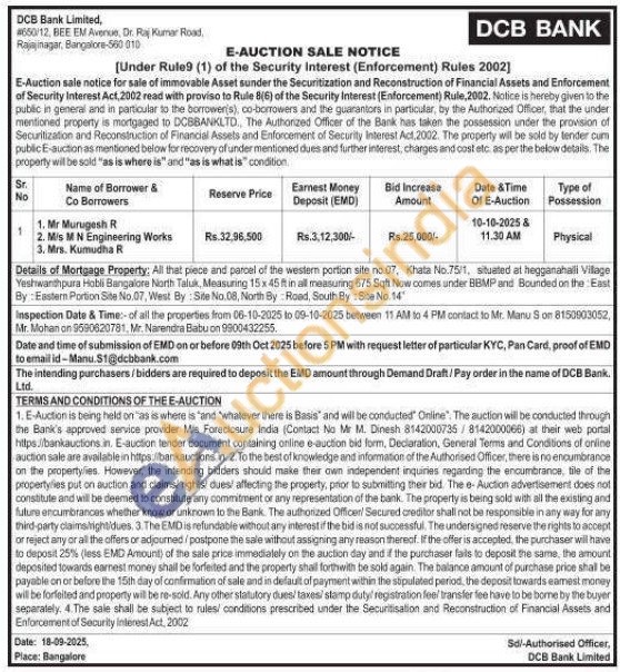 Details of Mortgage Property; All that piece and parcel of the western portion site no.07, Khata No.75/1, situated at hegganahalli Village Yeshwanthpura Hobli Bangalore North Taluk, Measuring 15 x 45 ft in all measuring 675 Sqft Now comes under BBMP and Bounded on the East By: Eastern Portion Site No.07, West By: Site No.08, North By Road, South By: Site No. 14