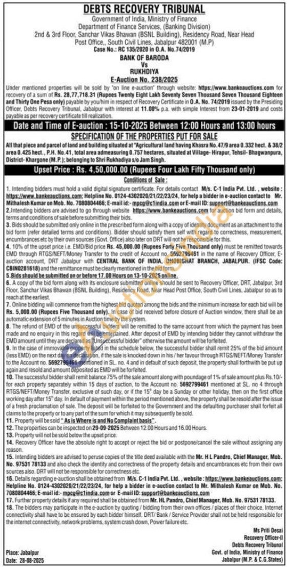 All that piece and parcel of land and building situated at "Agricultural land having Khasra No. 47/9 area 0.332 hect. & 38/2 area 0.425 hect., P.H. No. 41, total area admeasuring 0.757 hectares, situated at Village-Hirapur, Tehsil-Bhagwanpura, District-Khargone (M.P.): belonging to Shri Rukhadiya s/o Jam Singh