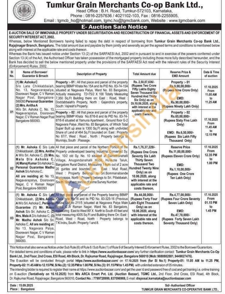 Property: 01: All that piece and parcel of the property , bearing BBMP Khata No. 15A and its PID No. 83-74-15A , situated at Nagavara Palya, Ward No. 83 Bangalore, Actually measuring 72-75/2 X 100 Totally Measuring -7,350 Sq.Ft Building there on: East Road, West Doddabbalah's Property, North Gajendra's property, South: Vajresh's Property.