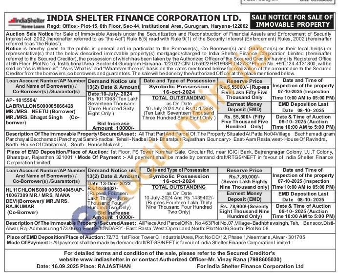 AllPiece And Parcel OfKh. No.463Plot No.07, Village-Badhbhawsingh, Teh. Bansoor, Distt-Alwar, Raj-Admeasuring 173.06 sq. Feet BOUNDARY:- East: Rasta, West: Open Land, North: Plot No.06, South: Plot No.08