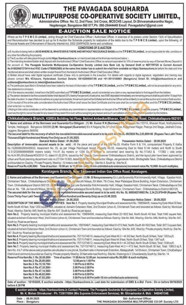 All the plece and parcel of the Site No.05. Khatha Form 9 & 11A, computerized Property E Katha No. 152800602800420033. Assesment No. 05, as per Village Panchayat record Property No.05, measuring East to West 9.144 meters and North to South 125120399999999999 meters totally 114.41 Sq meters or 1200 Sq ft formed in converted land bearing Sy No. 17/342 & 17:382 (vide order No ALN SR. (Shi Sakala/453/2012-13, dated 01.02.2014, issued by the Deputy Commissioner Chikkaballapura District, and the layout plan have been approved by Urban and Rural planning department vide no 27/104-15 503, dated 29.09.2014) Byrasandra Vitage, Jangamakote Hobil, Shidlaghatta Taluk, Chikkaballapura District and bounded on: Eastby Private Property, Westby: 12 meters vide Road, North by Site No 4, South by Site No. 6