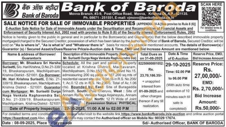 Schedule: All the part and parcel of property located at Krishna District, Machavaram, Machilipatnam, D.No. 15/215, MPL Ward No. 15, admeasuring 200 sq.yards or 167.200 sq.mts of - residential vacant site (Ac. 0.94 cts in R.S. No.206/1; Ac.0.12 cts in R.S. No 236/5: Total of Ac. 1.06 Cls). Bounded by: East: Site of Buragadda Srinadh, South: Pula Cheruvu, West: Site of Annam Rama Venkata Naga Anjaneyulu, Annam Raja Bappana Rao, North: 12 Ft Wide of Joint Passage