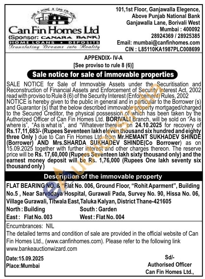 FLAT BEARING NO. & "Flat No. 006, Ground Floor, "Rohit Aparment", Building No.5, Near Sarvodaya Hospital, Gurawali Pada, Survey No. 90, Hissa No. 06, Village Gurawali, Titwala East, Taluka Kalyan, District Thane-421605