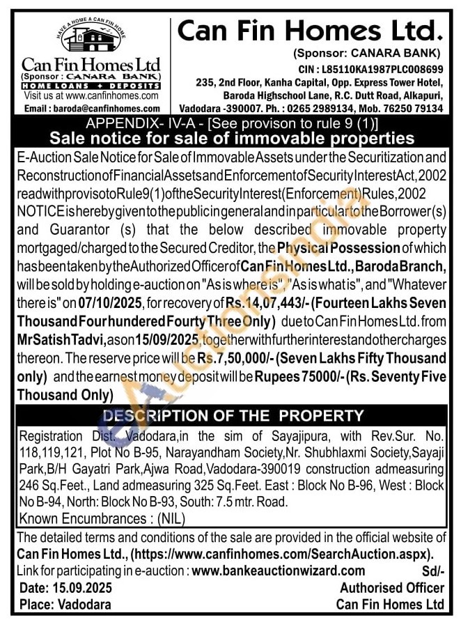 Registration Dist. Vadodara, in the sim of Sayajipura, with Rev.Sur. No. 118,119,121, Plot No B-95, Narayandham Society, Nr. Shubhlaxmi Society, Sayaji Park, B/H Gayatri Park, Ajwa Road, Vadodara-390019 construction admeasuring 246 Sq. Feet., Land admeasuring 325 Sq. Feet. East: Block No B-96, West: Block No B-94, North: Block No B-93, South: 7.5 mtr. Road.