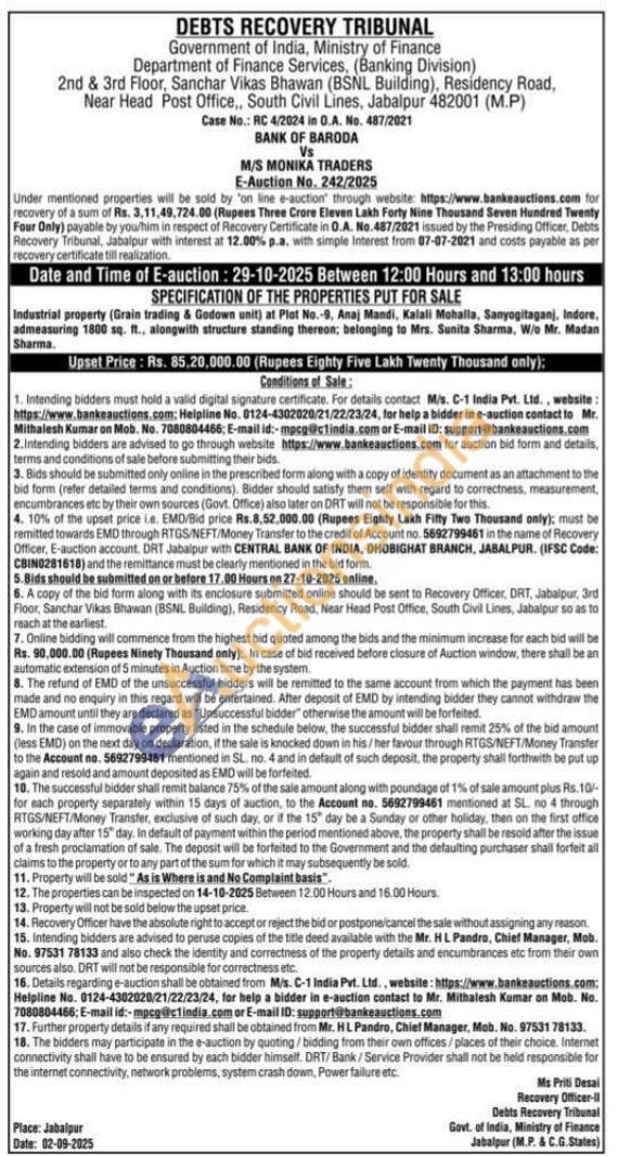 Industrial property (Grain trading & Godown unit) at Plot No.-9. Anaj Mandi, Kalali Mohalls, Sanyogitaganj, Indore, admeasuring 1800 sq. ft., alongwith structure standing thereon; belonging to Mrs. Sunita Sharma, W/o Mr. Madan Sharma.