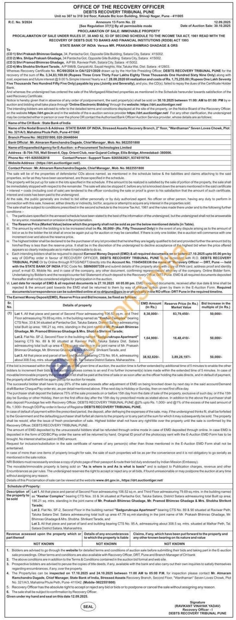 Lot 2. Flat No. SF-2. Second Floor in the building named "Sadgurukrupa Apartment" bearing CTS No. 89 & 90 situated at Raviwar Peth, Taluka Satara Dist. Satara admeasuring total built up area 47.78 sq.mtr.standing in the joint name of Mr. Prakash Bhimrao Ghadage, Mr. Bhimrao Ghadage & Mrs. Shobha Shrikant Tarade, and