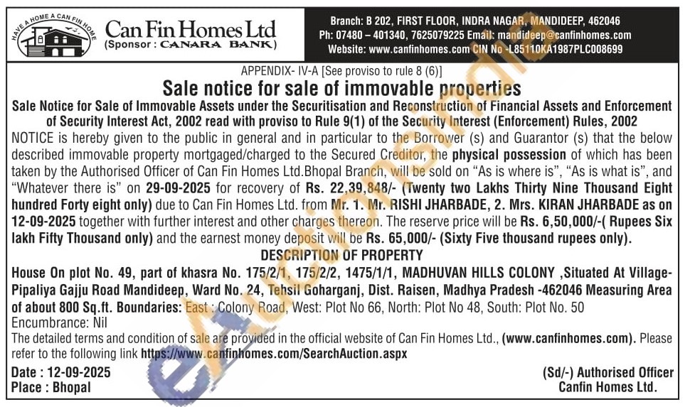 House On plot No. 49, part of khasra No. 175/2/1, 175/2/2, 1475/1/1, MADHUVAN HILLS COLONY, Situated At Village-Pipaliya Gajju Road Mandideep, Ward No. 24, Tehsil Goharganj, Dist. Raisen, Madhya Pradesh -462046 Measuring Area of about 800 Sq.ft. Boundaries: East: Colony Road, West: Plot No 66, North: Plot No 48, South: Plot No. 50 Encumbrance: Nil