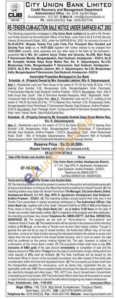 Schedule-A: (Property Owned by Mrs. Kumpatla Lakshmi, W/o. K. Satyanarayana) Item 1: Residential Land and Tied House to the extent of 157.50 Sq. Yards (RS.No. 111/1) bearing Door Number 3-36, Munjavarapu Kottu, Mungandapalem Gram Panchayat, P Gannavaram Mandal, East Godavari, Andhra Pradesh-533214. Boundaries, East: Site of Kolla Surya Rao, South Site of Tammana Venkata Narayana, West: Rajaveedhi, North Compound Wall of Kolla Subba Rao. Item 2: Residential Land and R.C.C. bulding to the extent of 194.25 Sq. Yards [R.S.No. 111/1] Nearest Door Number 3-36, Munjavarapu Kotlu Mungandapalem Gram Panchayat, P Gannavaram Mandal. East Godavari, Andhra Pradesh-533214 Boundaries, East: Passage, South: Compound Wall of Tammaria Venkata Narayana, West: Item 1 herein, North: Site of Kolla Subba Rao Schedule B: (Property Owned by Mr. Kumpatla Venkata Satya Surya Mohan Rao, S/o. K. Satyanarayana) Item 3; Residential Land to the extent of 2178 Sq. Yards (RS.No. 111/1) bearing Door Number 3-36, Munjavarapu Kottu, Mungandapalem Gram Panchayat, P Gannavaram Mandal, East Godavari, Andhra Pradesh-533214. Boundaries East: Gram Panchayat Road, South Site of Kumpatla Satyanarayana, West Compound Wall of Kumpatla Satyanarayana, North: Site of Kodamarthi Naradimham and Desaraju Sankan.